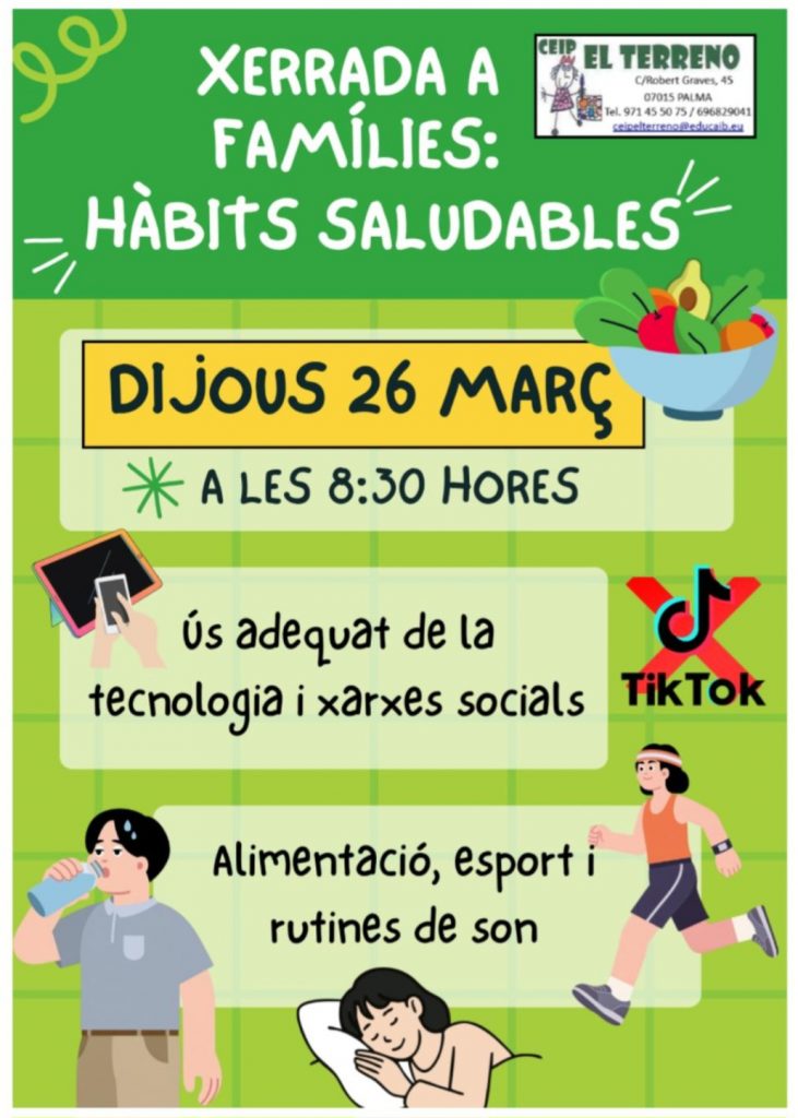 19/03/26Els convidam a assistir a la xerrada per a famílies, prevista per al dia 26 de març a les 8.30h a l’escola, impartida pels professionals Nerea Torrens (orientadora) i José Beas (PSC).