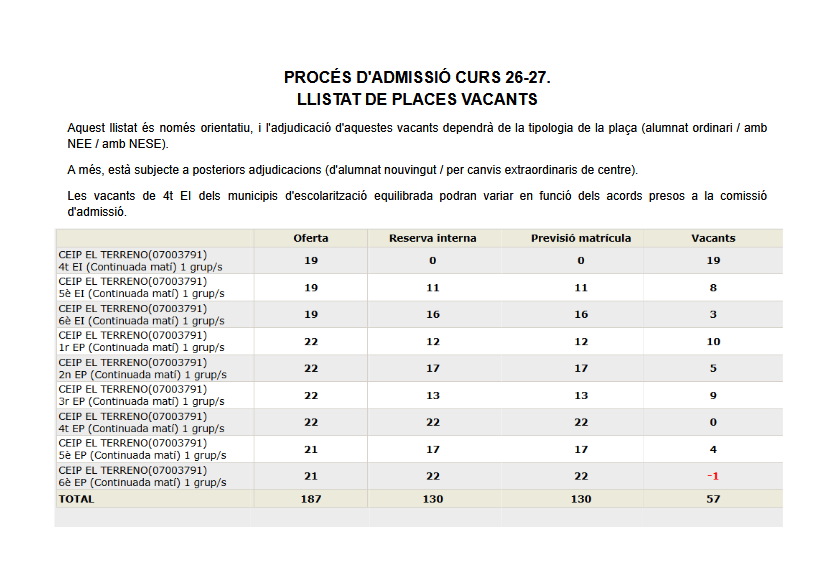 A continuació adjuntam l’enllaç a la plana web del Servei d’Escolarització (Conselleria d’Educació i Universitats), on podeu consultar el calendari i procediment del procés d’escolarització del curs 2026/27:
